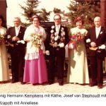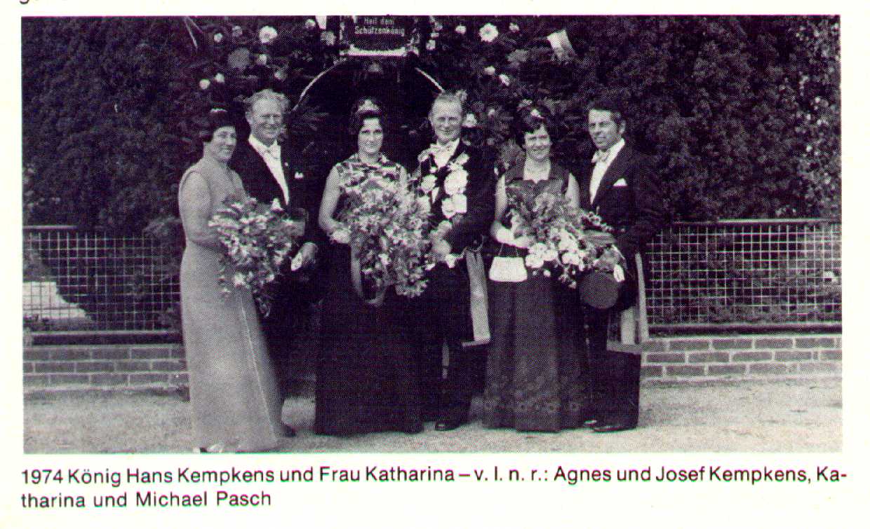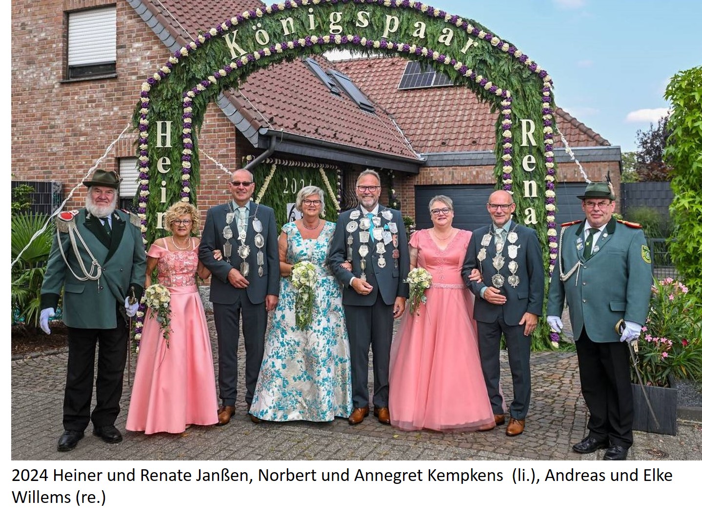 Unser aktueller König 2025 Könige 2000 - heute 2024: Heiner und Renate Janßen 2022: Josef und Ruth Pütters 2019: Peter Wilms und Marina Sobolewski 2018: Chris Post und Sandra Szucki 2017: Jürgen und Corinna Giesen 2016: Ferdi Paesch und Wally Piwkowski 2015: Christian Cleve und Kathrin Rümmler 2014: Herbert und Angela Borghorst 2013: Georg und Ute Wolters 2012: Walter und Kerstin Kempkens 2011: Michael und Ursula van Meegen 2010: Ernst und Margret Cleve 2009: Georg-Phillip Aenstoots 2008: Bernd und Karin Peerenboom 2007: Alfred Clanzett und Heidi Küpper 2006: Werner und Renate Schyrba 2005: Emil und Hildegard Kempkens 2004: Hedwig und Klaus Gerads 2003: Ernst und Marietta Kempkens 2002: Karl und Karin Post 2001: Micky und Sandra Torhala 2000: Alfons und Karola Hacks Könige 1976-2000 1998: Andre und Hildegard Seegers 1997: Franz Post und Stefanie Kahl 1996: Günter und Angelika Reitz 1995: Norbert und Annegret Kempkens 1994: Klemens und Luise Verhoeven 1993: Hans-Josef Kempkens und Anne Backus 1992: Georg Paesch und Melanie Ophey 1991: Georg und Ulrike Aenstoots 1989: Leo und Margret Franken 1988: Paul Kempkens und Veronika Clanzett 1987: Karlheinz und Margret Quinders 1986: Josef und Käthe van Stephout 1985: Horst und Brigitte Molderings 1984: Vinzenz und Maria Hacks 1983: Manfed und Annerita Kempkens 1982: Michael und Kathrinchen Paesch 1981: Hans-Jakob Kempkens und Annegret Haschke 1980: Heinz und Claudia Krieger 1979: Josef und Agnes Kempkens 1978: Matthias und Mathilde Leuker 1977: Willi und Maria Roosen 1976: Hans und Agnes Hascke Könige 1925-1975 1975: Hermann und Käthe Kempkens 1974: Hans und Katharina Kempkens 1973: Heinz und Gertrud Valks 1972: Wolfgang und Marlies Torhala 1971: Josef und Agnes Grauthoff 1970: Felix und Anneliese Schyrba 1969: Josef und Käthe van Stephoudt 1968: Peter und Franziska van Meegen 1967: Matthias und Maria van den Hövel 1966: Theo und Hanni Post 1965: Heinz und Elisabeth Onkels 1964: Heinz und Cecilia Sleuwen 1963: Hans und Maria Derstappen 1962: Bernhard und Gertrud Jentjens 1961: Michael Paesch mit Anneliese Bonnes 1960: Ernst und Elisabeth Ophey 1959: Willi und Maria Ophey 1958: Paul Kempkens und Hendrina Hendricks 1957: Johann und Mathilde Onkels 1956: Walter und Gertrud Franken 1955: Jakob und Adle Fonteyne 1954: Paul und Maria Clanzett 1953: Hermann Kempkens und Maria Wolters 1952: Johann und Sophia Ophey 1951: Jakob Onkels mit Maria Baumanns 1950: Matthias und Margarete Roosen 1949: Johannes Clanzett mit Frl. Dicks 1948: Hermann Kempkens mit Maria Hagmann 1947: Josef Clanzett mit Hannelore Düppe 1935: Wilhelm Opgenorth mit Helene Kamps 1934: Heinrich Roosen und Nelli Rogmann 1933: Heinrich Hacks mit Bernhardine Franken 1931: Heinrich Vester und Gretchen Weber 1930: Jakob Rosen und Käthe Jentjens 1929: Walter Franken und Gretchen Bouten 1928: Bernhard Beckedahl mit Gertrud Stammen 1927: Heinrich Vester und Toni Straeten 1926: Jakob Jentjens und Grete Wolters 1925: Heinrich Ripkens und Dora Sleuwen
